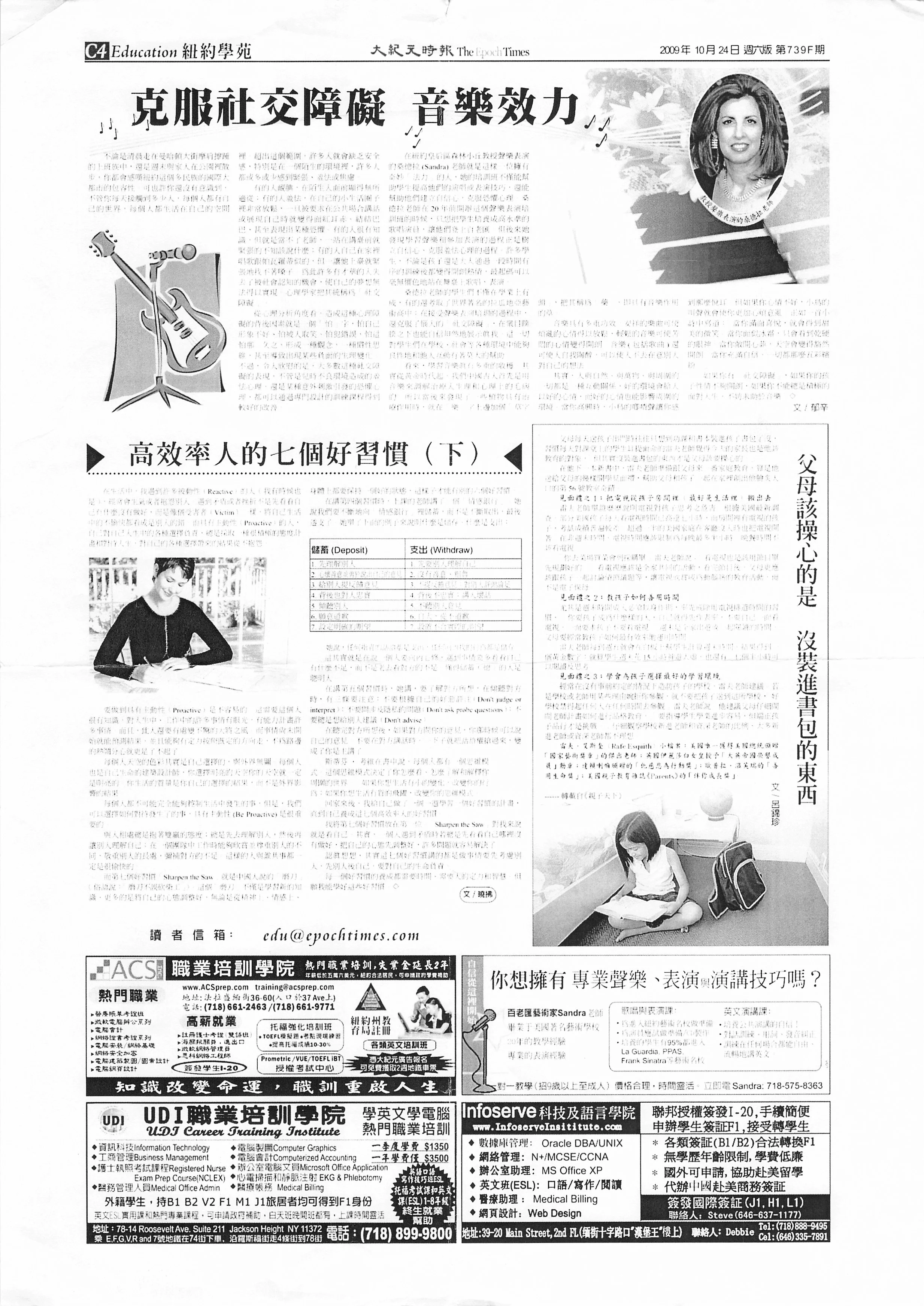 The Chinese-language newspaper The Epoch Times explores Sandra’s vocal coaching methods and conversational English instruction as a method for overcoming impaired social interaction.